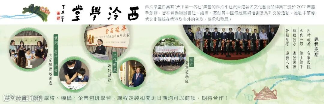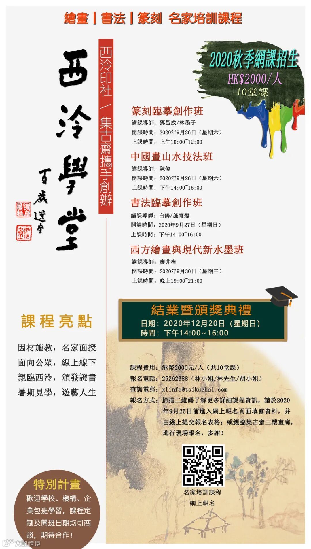 自2017年創辦以來,西泠學堂的師資隊伍、課程設置等不斷優化創新,成功舉辦了六期線上、線下的篆刻、書法、繪畫專業培訓班,已成為香港首屈一指的中國文化藝術專業培訓精品課堂品牌。新冠疫情下,繼2020年春季網絡課程成功舉辦之後,秋季課程將繼續以網絡授課形式進行,2020年9月26日(星期六)正式開課。