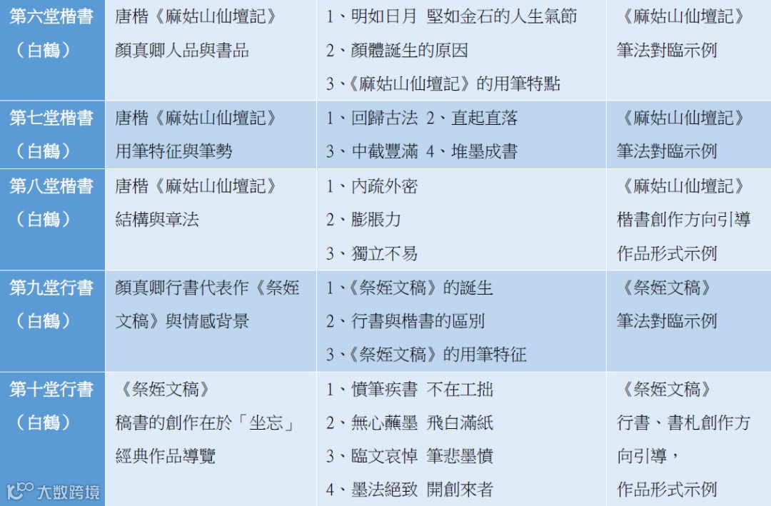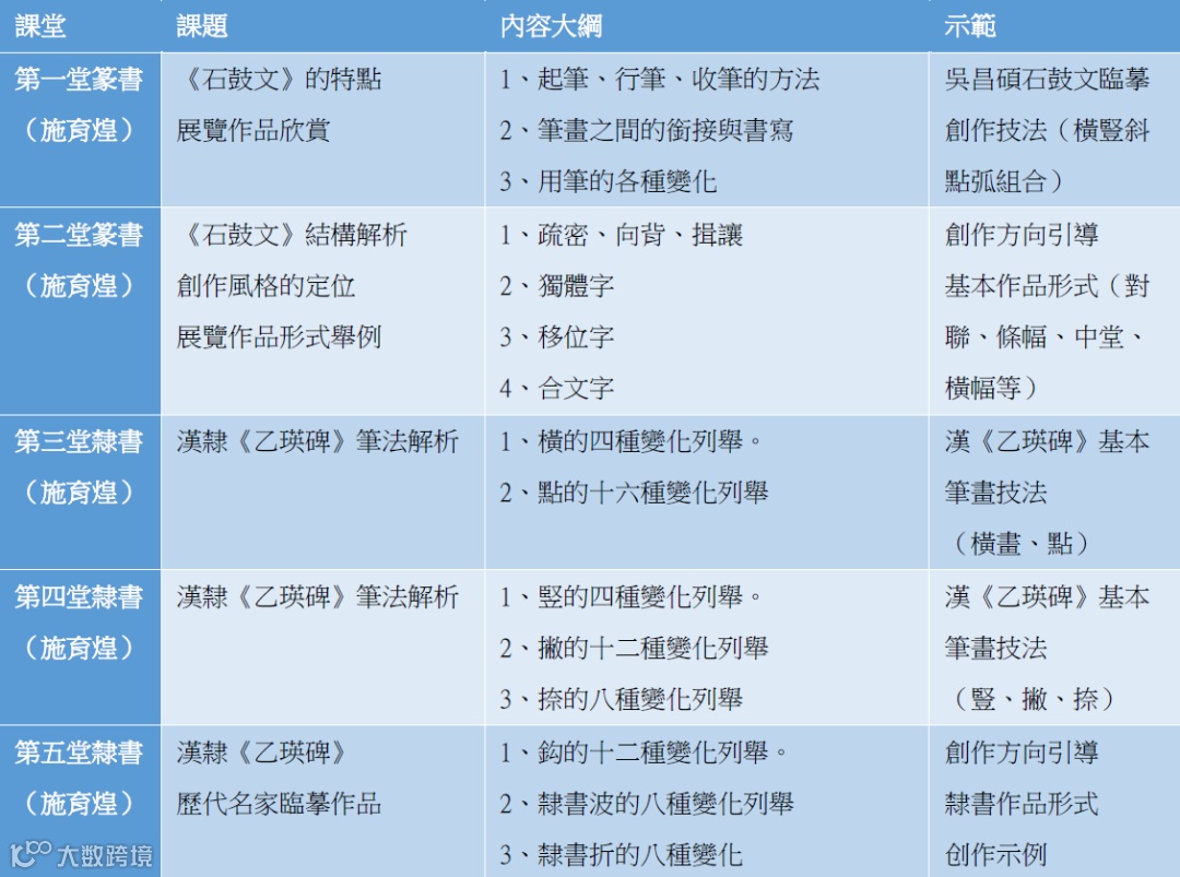 培訓內容:本期網絡課程邀請白鶴、施育煌二位導師講解篆隸楷行四種書體。課程將帶大家從臨摹規範進入,逐一解構字體書寫要素及強調運筆節奏和技法表現,同時導師也會根據字體範例進行創作引導,幫助有基礎學員從臨摹一步步走向創作。