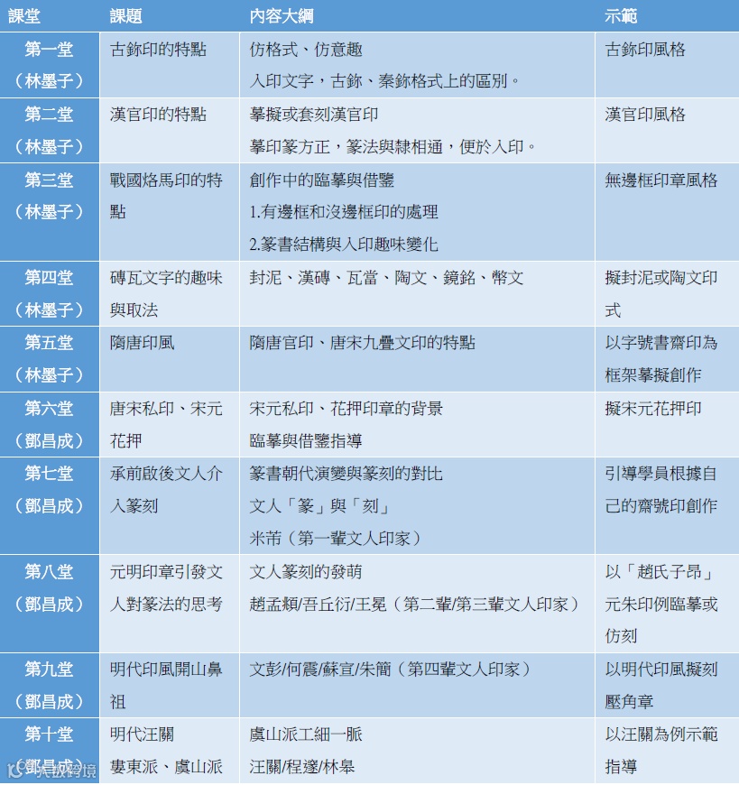 培訓內容:本期網絡課程適合對篆刻有興趣的各程度人士,包括零基礎學員。課程將帶領學員從經典出發,對初學者講解臨摹的基本要素,課程有大量的近距離鏡頭示範,清晰展示運刀行刀技法。有基礎的舊學員,導師將會從理念上引導創作,幫助學員從格式上借殻設計,或者從意趣上模仿創作。每堂課都安排有作業點評互動環節,導師也會因各人水準進行啟發性引導,期待在教與學的互動中,相互促進共同提升。