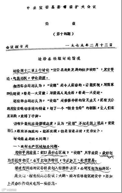 圖 | 1979年2月13日寶安縣委常委擴大會議簡報(第十四期)第一次出現「特區」二字。