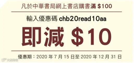 於中華書局自營網店下單輸入優惠碼即享10HKD優惠(僅限中華書局自營店鋪使用)。