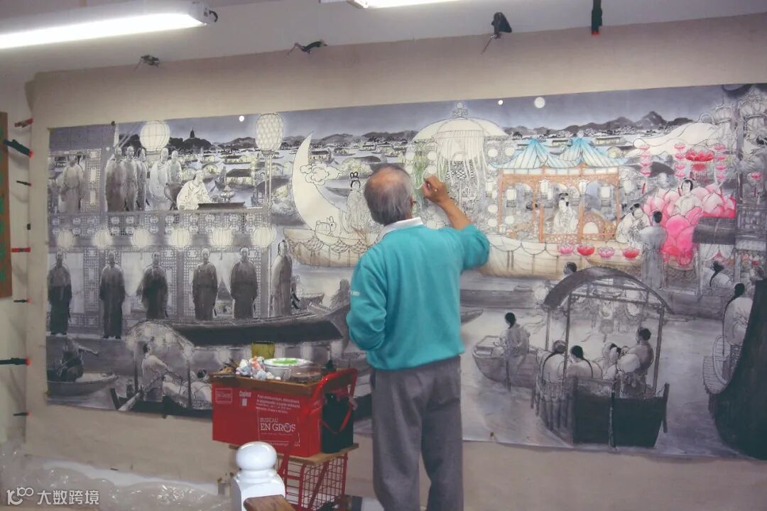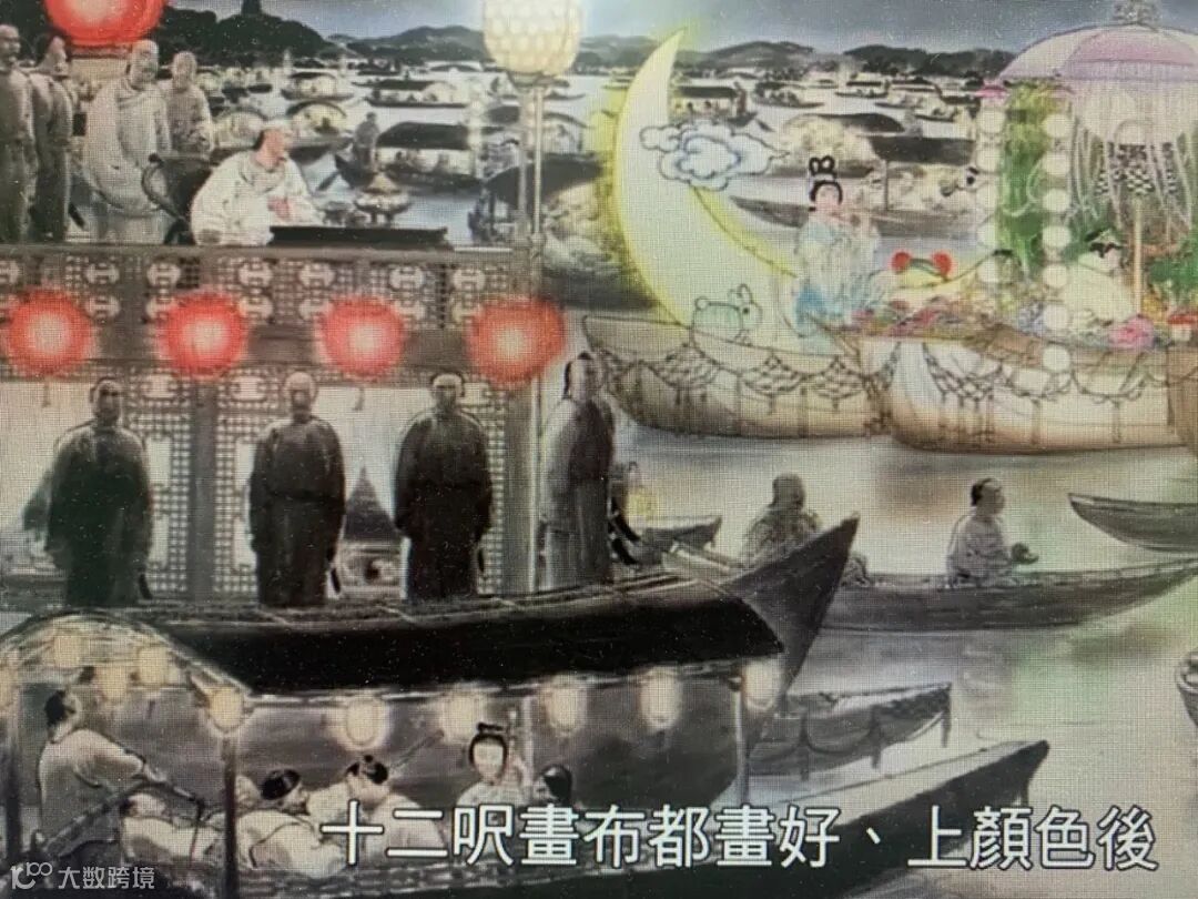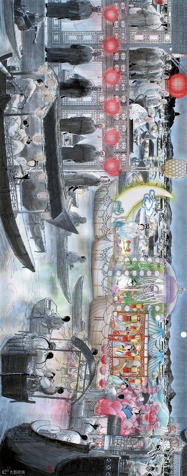 《乾隆皇西湖選妓》一圖,寬長的十二尺畫面,是最好處理寬廣環境的。