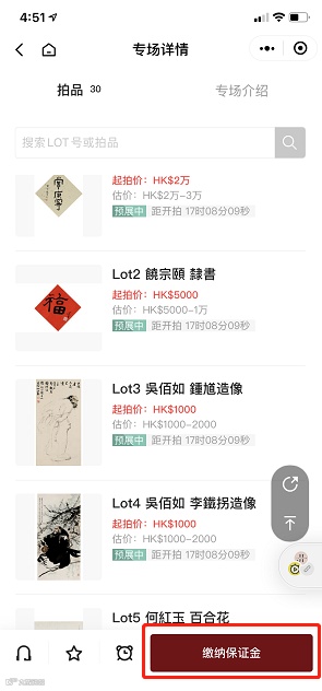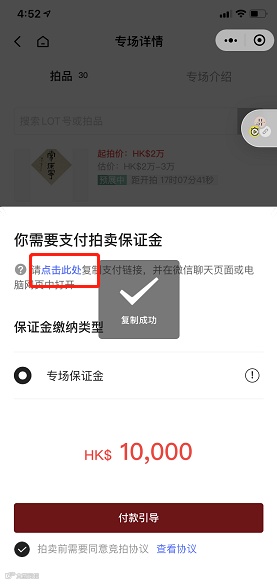 進入微信淳浩網拍小程序頁面後,點擊「繳納保證金」,根據指引複製支付鏈接。