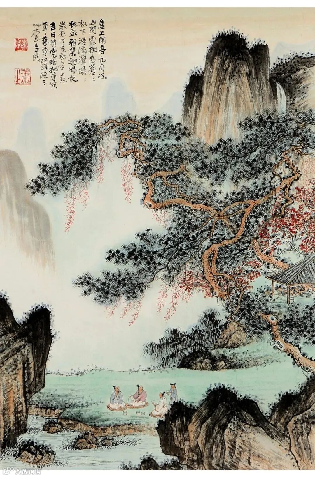 題識:崖上閑亭九月涼,山間雲樹色蒼蒼。松下清流聲潺潺,林泉雅集趣味長。歲在丁亥初冬上弦吉日,晴窗略拟唐寅華意。申江清溪三草堂立民。