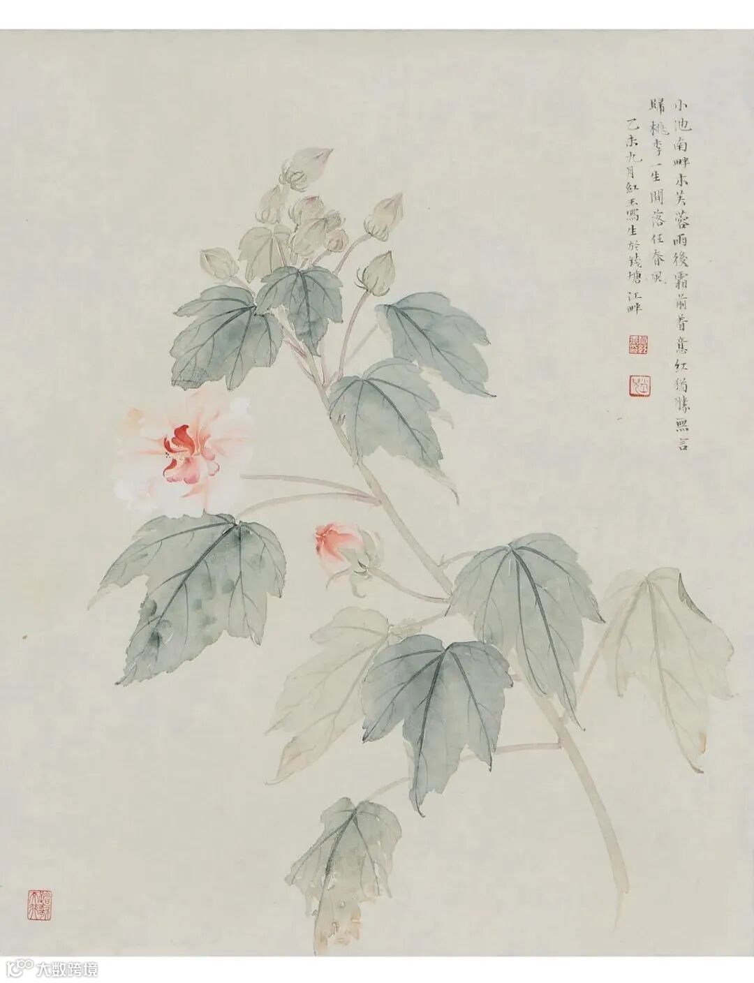 題識:小池南畔木芙蓉,雨後霜前着意紅。猶勝無言歸桃李,一生開落任春風。乙未九月,紅玉寫生於錢塘江畔。