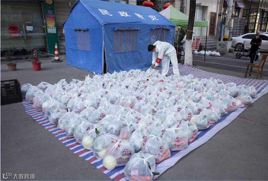 山東滯留武漢的志願者小侯在球新社區門口分菜。| 劉宇 攝