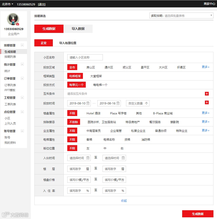 根据客户需求生成实时数据后呈递客户,客户选择好投放小区与数量后再导入,系统默认遵循最大化使用版位原则自动生成版位数据。