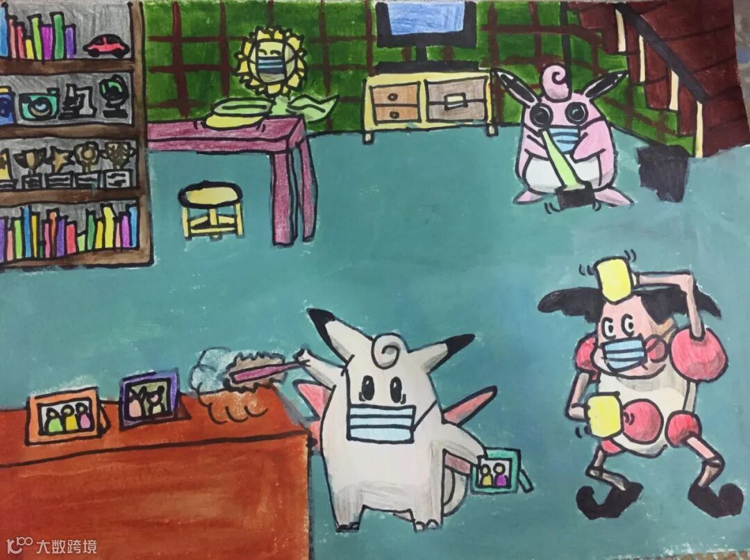 創作理念:大人與小朋友居家清潔環境,齊心抗疫。