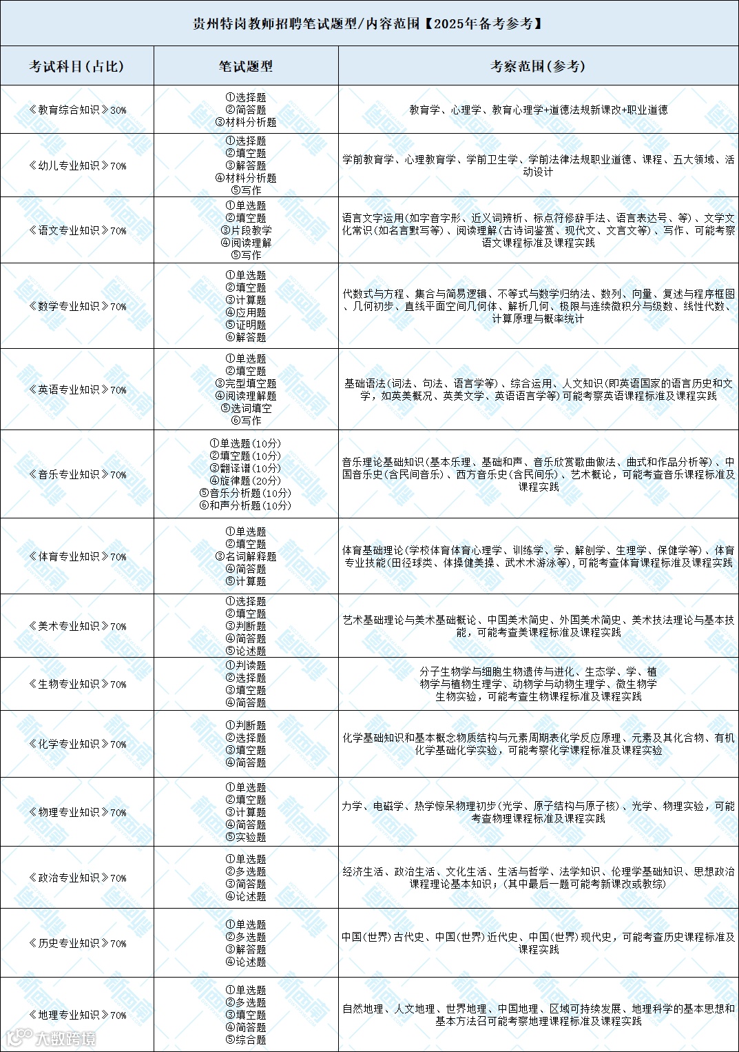 贵州特岗各学科笔试题型\内容范围