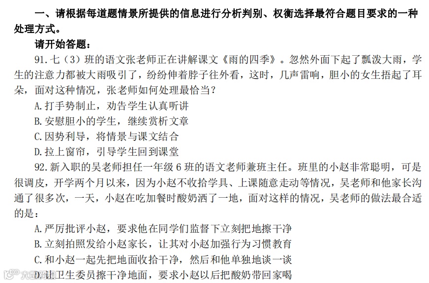 《综合应用能力(D 类)》是针对中小学和中专等教育机构的教师岗位公开招聘工作人员而设置的考试科目。旨在测查应试人员综合运用教育学、心理学等相关知识和技能, 分析、解决中小学教育教学问题的能力。