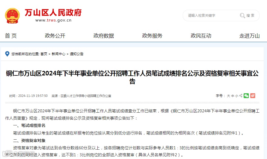 笔试成绩排名及资格复审公布