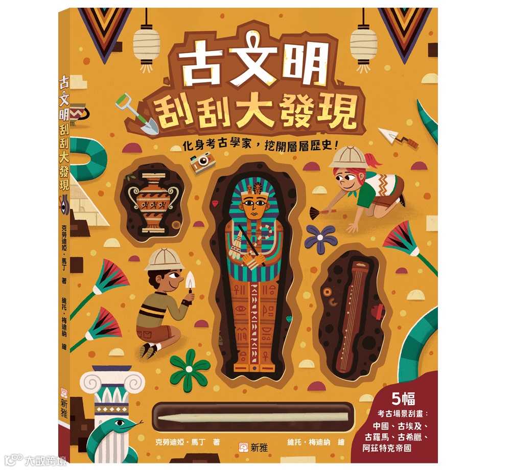 本書包羅世界各地的5個考古遺迹,包括:中國、古埃及、古羅馬、古希臘及阿茲特克帝國,它們埋藏着一些古代的寶藏。利用刮刮筆,小讀者們即可在考古場景刮畫中挖掘文物,滿足探索慾,為大家帶來沉浸式考古體驗。