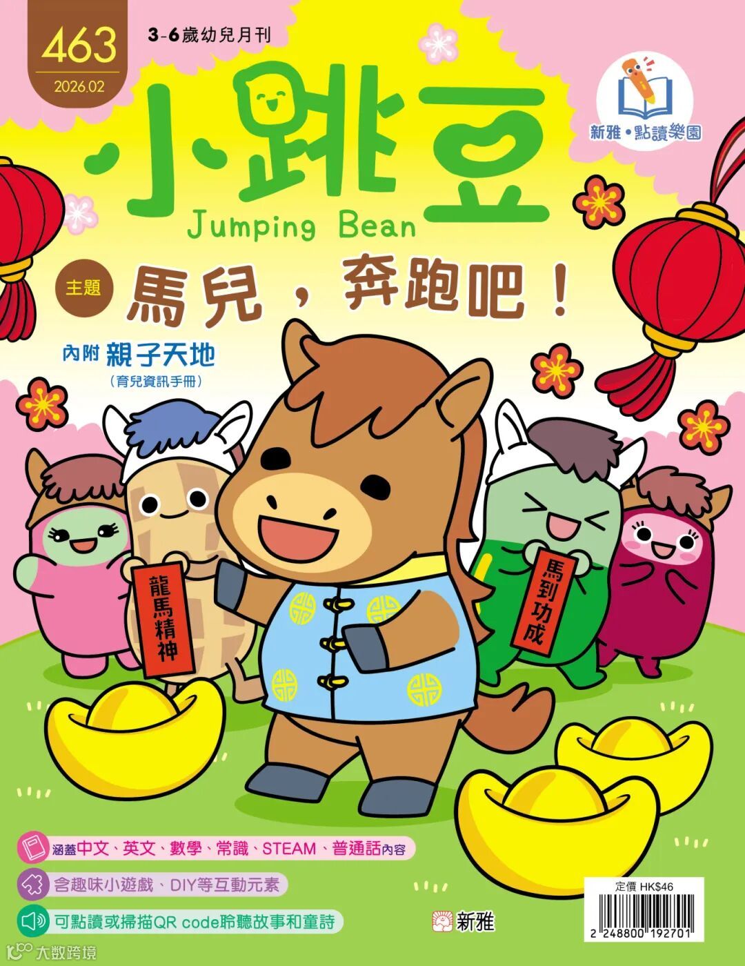 本月雜誌以「馬兒,奔跑吧!」為主題,邀請小朋友們一同了解農曆馬年。在「主題大探索」中,跳跳豆教大家認識馬兒不同身體部位的作用;在「豆豆品德故事」中,跳跳豆騎着厲害的戰馬迎接挑戰。新一年,祝小朋友快高長大、龍馬精神!