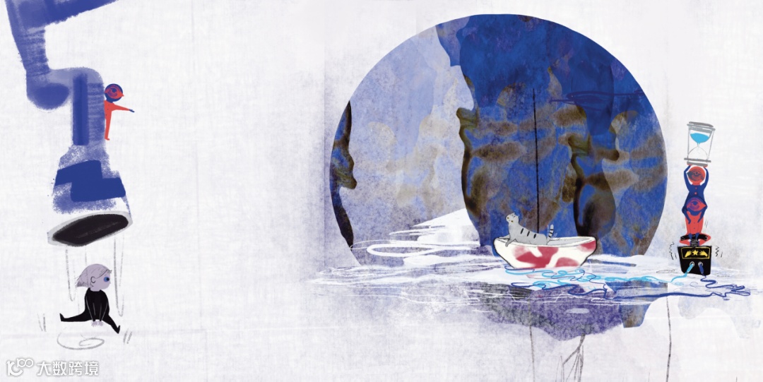小女孩掉進了大怪獸黑黑的世界裡,不遠處有隻可愛的小貓正在朝她喵喵叫。