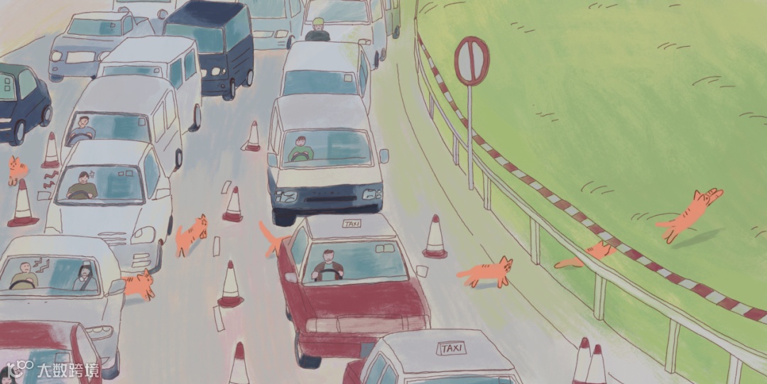 小貓自由、靈活地穿過擠塞的高速公路,牠的步伐輕盈,與停滯不前的汽車形成強烈對比。