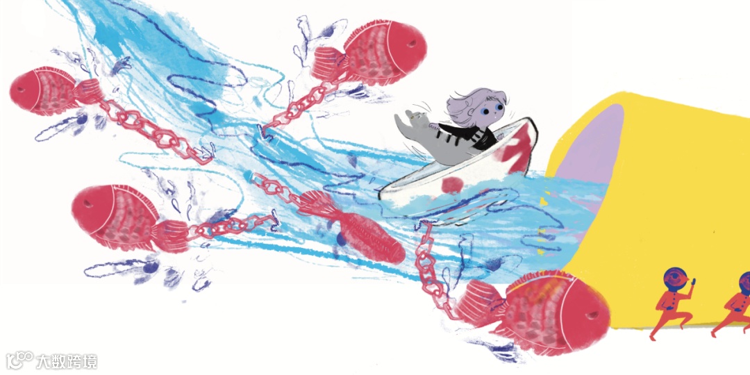 水一邊嘩啦嘩啦地流淌,小貓被沿途的玩具吸引住了,想要撲出「小船」外,幸好小女孩把牠緊緊抓住。