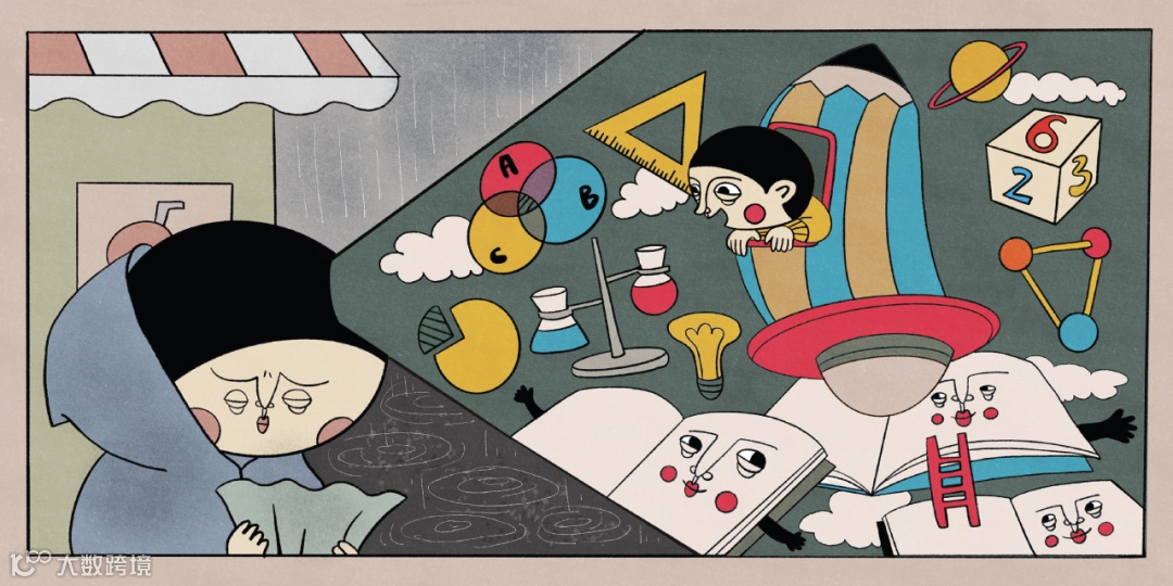 閉上眼睛以後,男孩幻想自己在學習的世界馳騁。他想起學習並不是只帶給他煩惱的,頓時感到豁然開朗,心情變好了!