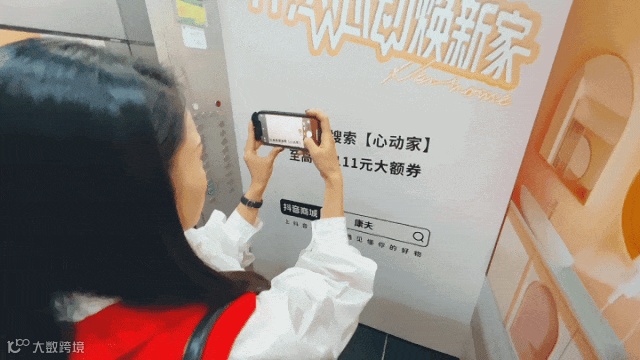 走进电梯,前、后、左、右,目之所及全被抖音“怦然心动换新家”和大牌家装产品包围。俨然整部电梯被抖音电商