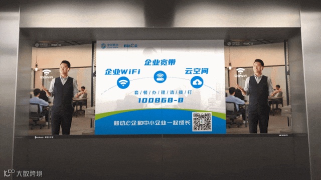 近日,中国移动登陆梯影大屏,推广“移动e企”企业办公用网