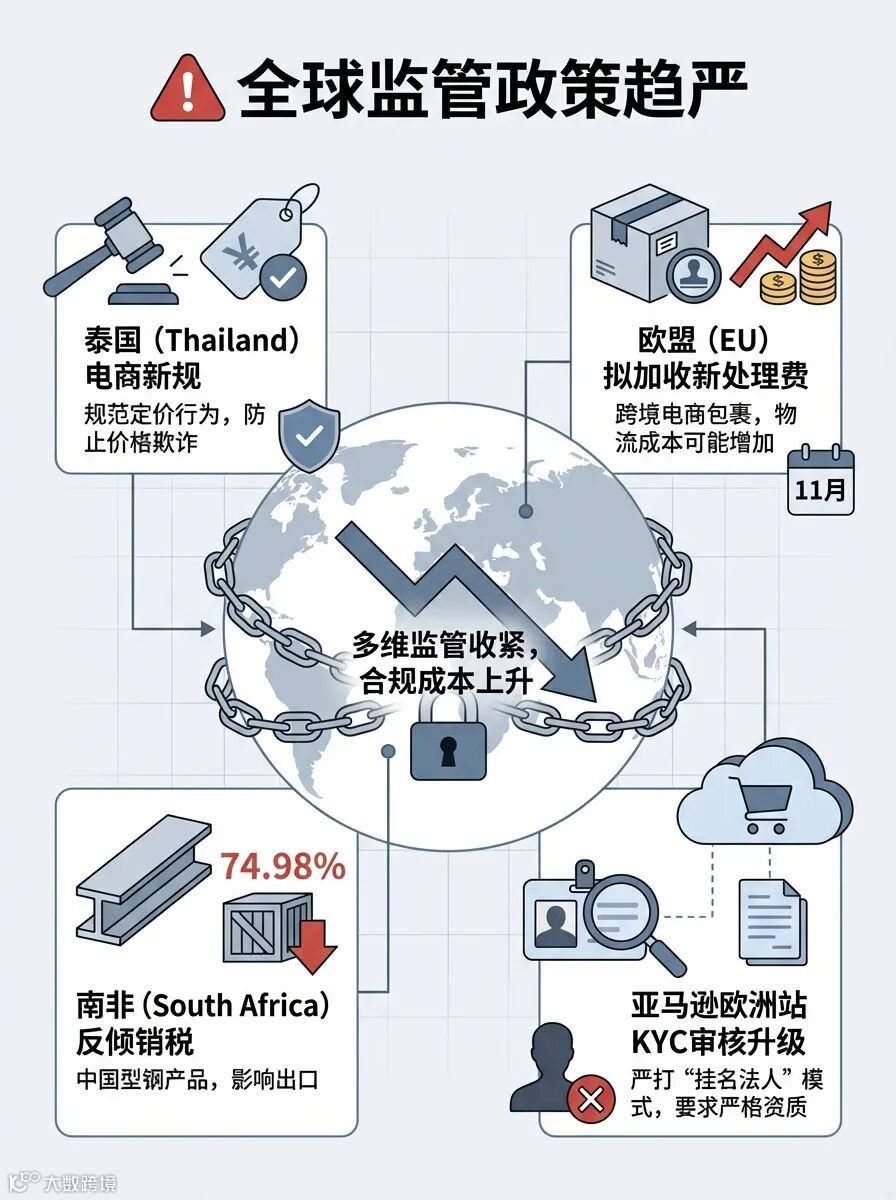 泰国出台电商平台新规,要求平台规范定价行为,防止价格欺诈。欧盟拟对跨境电商包裹加收新处理费,最迟11月实施,可能增加物流成本。南非对中国型钢产品征收最高74.98%反倾销税,影响相关品类出口。亚马逊欧洲站KYC审核升级,严打“挂名法人”模式,要求卖家提供更严格的资质证明。