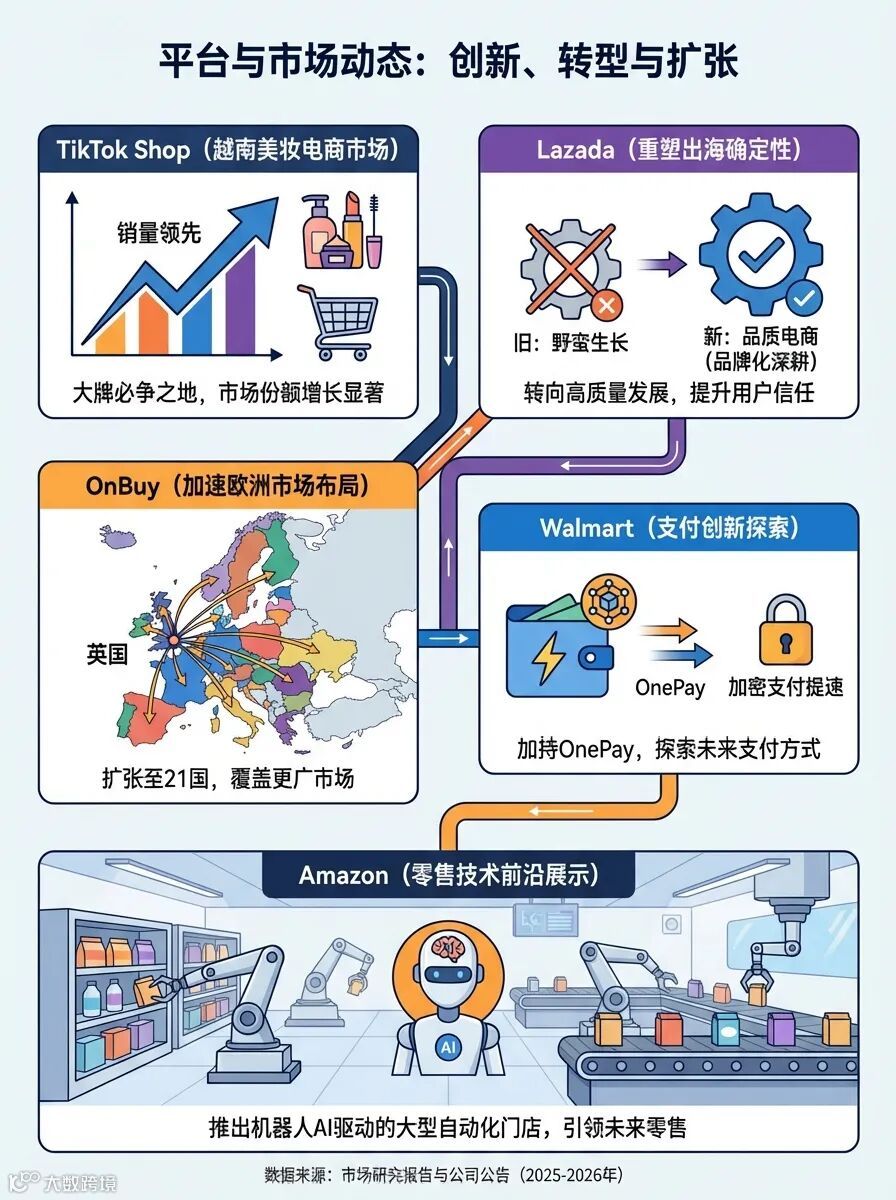 简评:TikTok Shop与Lazada的品牌化趋势显示电商竞争进入品质阶段。OnBuy的扩张为卖家提供更多渠道选择,而支付与零售技术的创新可能重塑未来购物体验。🏆
