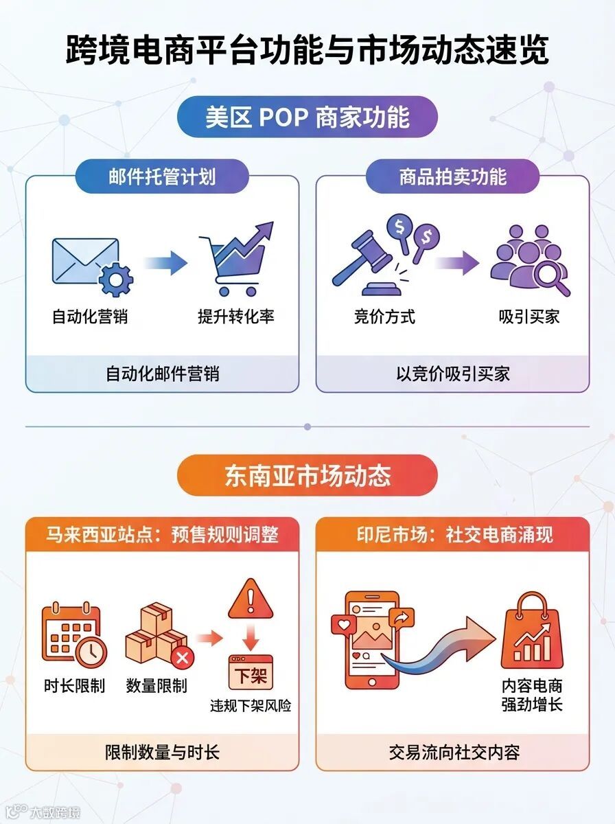 简评:平台功能日益精细化,邮件托管与拍卖功能有助于卖家优化营销策略。但预售规则收紧提醒卖家需关注平台政策变化,避免违规。社交电商的崛起为跨境卖家提供了新的流量入口。💡