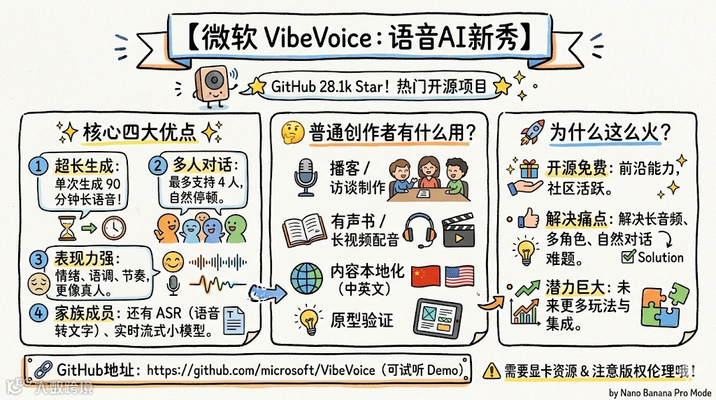 微软近期开源的VibeVoice语音AI模型GitHub获28.1k stars。该技术突破性地支持单次生成90分钟连贯对话,并实现最多4人交替发言,自然度媲美真人交互。