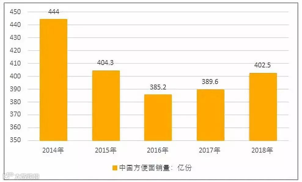 世界方便面协会数据则显示,中国方便面市场销售量在经过3年下跌后,于2018年起又出现明显回升,预测2019年中国方便面销量有望维持在400亿份以上。