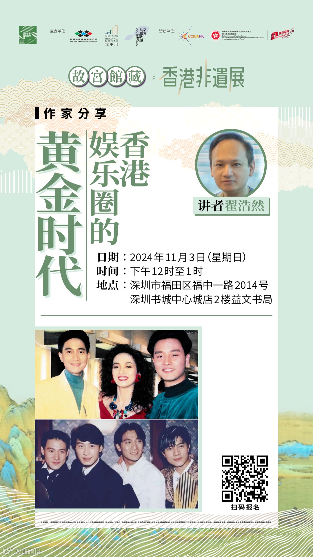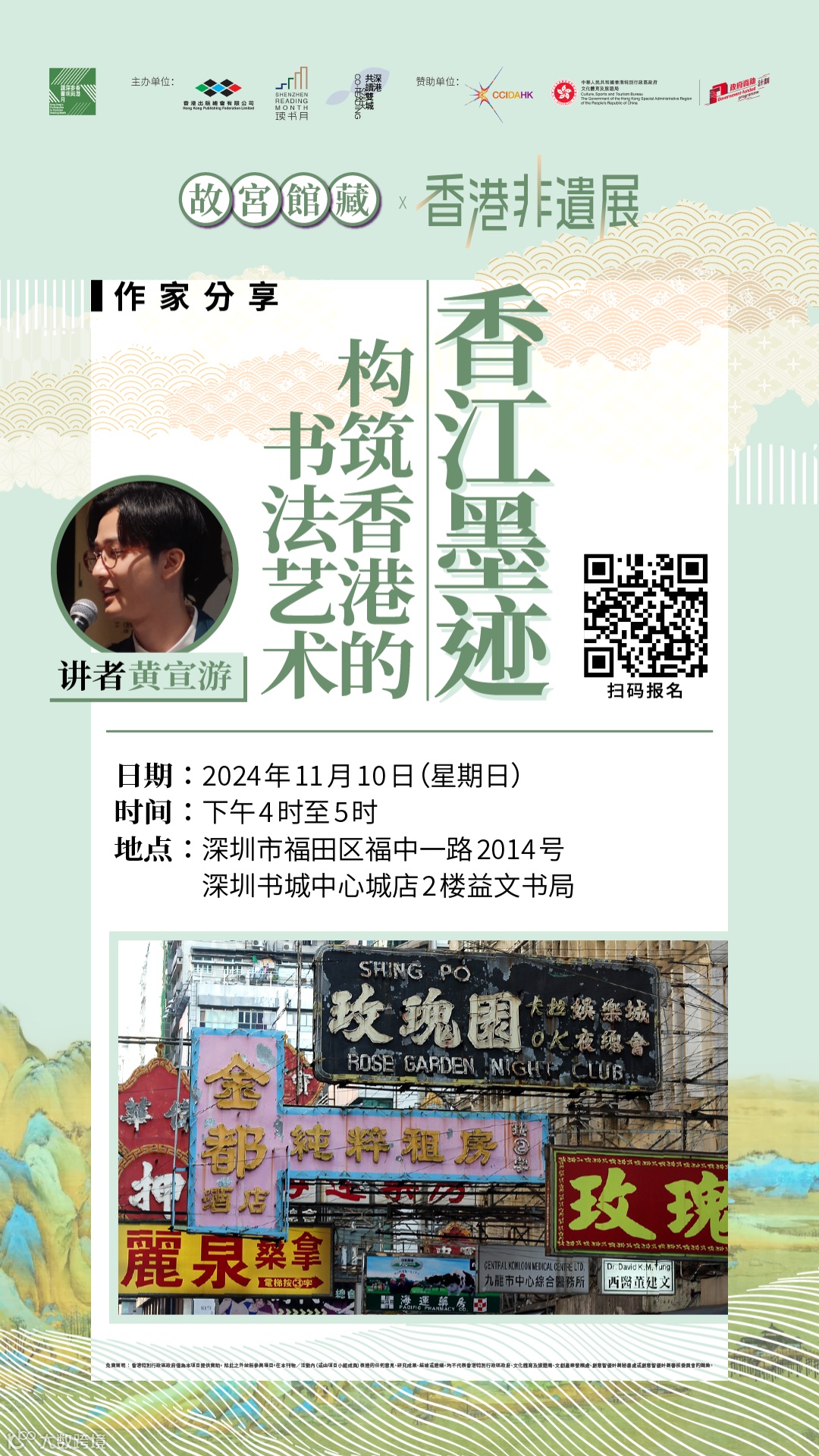 活動簡介:上世紀30至80年代,香港4位著名書法家區建公、謝熙、卓少衡及黎一鳴,以書法作品塑造出香江半世紀獨一無二的城市風貌。本次講座,講者將借其新作《香江墨跡——構築香港的書法》,細述以學術形式存記香港書法美學的點滴。