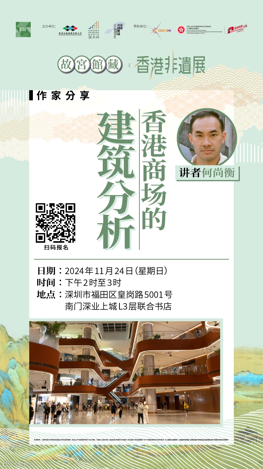 活動簡介:細察香港商場的規劃、功能和設計,猶如觀看一個城市的空間運用、地道消費文化、生活形態及品味的縮影。講者將藉其著作《香港商場的黃金時代》,向觀眾分享他研究香港商場逾十年的成果種種有趣觀察。