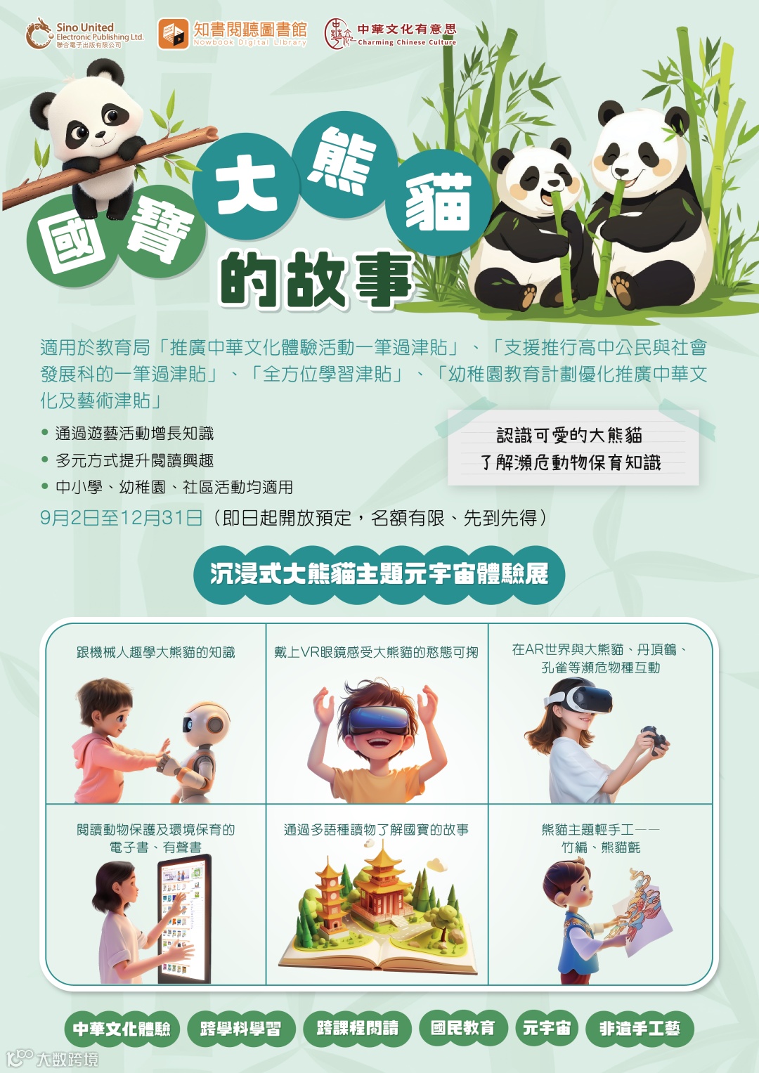 《我長大了——大熊貓茜茜成長故事》中、英語版現已收錄在知書閱聽圖書館——「國寶大熊貓的故事」主題書單中。更有「沉浸式大熊貓主題元宇宙體驗展」供學校師生參與體驗。