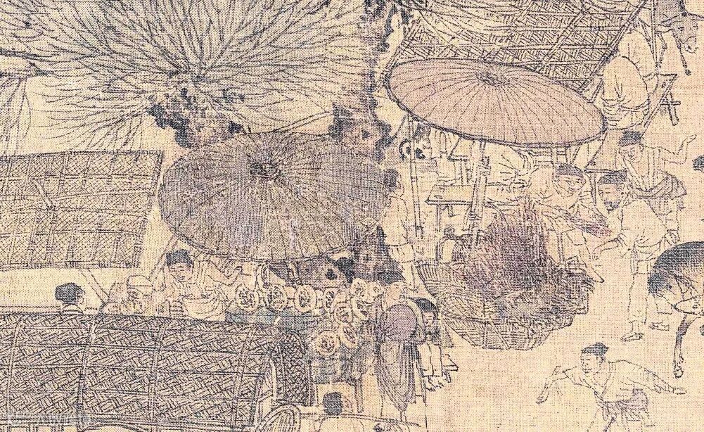 平橋橋頭和護城河邊有數家店舖,頭一家是餅舖,賣的是棗䭅。棗䭅的做法是在發麵餅上嵌上大棗,這種食物在孟元老所著《東京夢華錄》裏有記載:「都城之歌兒舞女遍滿園亭,抵暮而歸,攜棗䭅、炊餅……」這兩段記載既說明這是清明節特別要吃的一種餅,也證明這幅圖畫的是清明節。