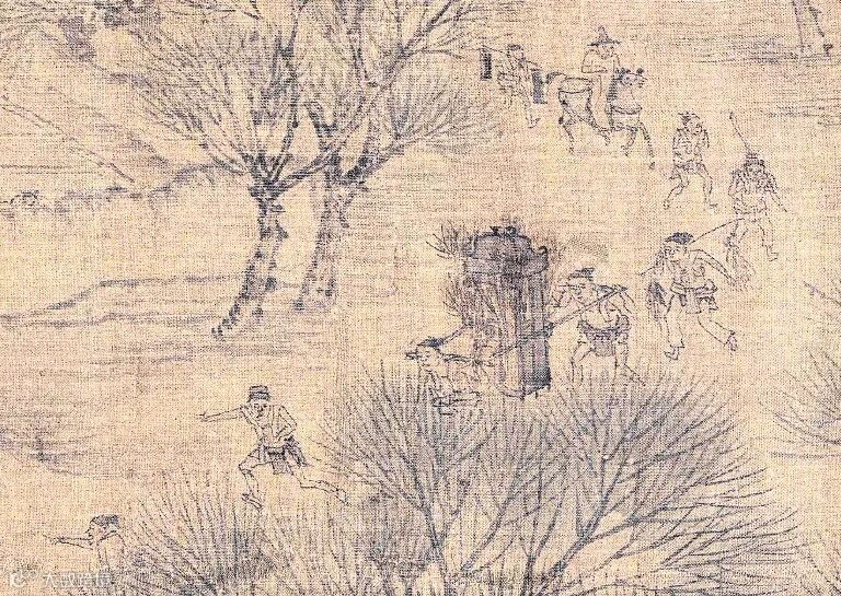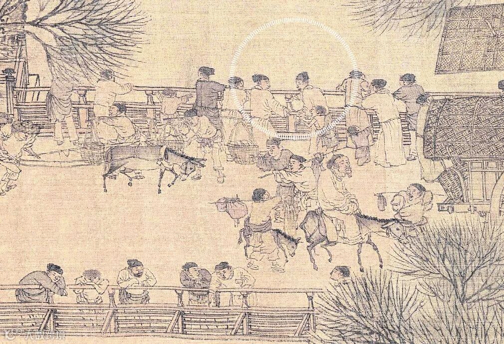 宋人的習慣是喜歡早起、早出門,快到晌午了,他們已經出城很遠,也許是祭掃?也許是出遠門?反正這些人挺艱難的。在古代,老百姓的代步工具就是毛驢,不能騎馬,馬是官員的坐騎。張擇端作畫,喜歡搞對比表現,這邊畫了騎驢的下層百姓,那邊就要畫上騎馬的官家。