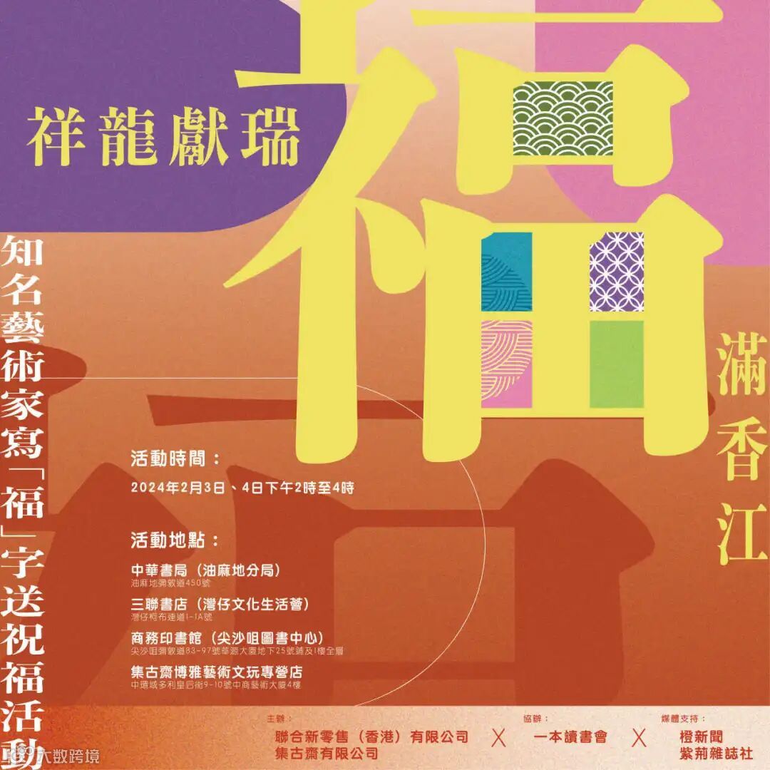 由聯合出版集團旗下集古齋及聯合新零售攜手主辦、一本讀書會協辦的「祥龍獻瑞福滿香江——知名藝術家寫『福』字送祝福」活動2024年2月3日起一連兩日舉行。