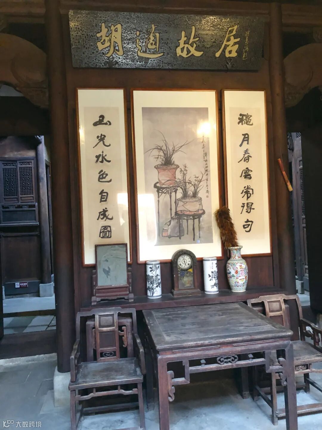 當地民風淳樸,我們到達時,故居已經關門,但經朋友與遊覽中心工作人員溝通,管鑰匙的解說員又從家裡趕來為我們開門,不疾不徐,讓我們隨意觀摩,舉手投足間的自然隨性讓我們倍感親切和自在。穿過一條長長的青石板小路,我們看到的胡適故居修舊如舊,大體上保持原貌,懸置着「蘭蕙書屋」的匾額,從室外看極為樸素,進入之後才發現別有洞天。我們先後觀摩了院落、客廳、臥室和胡適讀書的書房,每一處細節都大有深意,連庭院地面的設計都隱含着徽派文化的寓意。北大校友會捐贈的胡適坐像在小石子鋪就的庭院安靜如昨,胡適寫的「努力做徽駱駝」條幅掛在一間房子的牆上,意味深長。從房屋結構和規模等來看,胡家確實算不上氣派的大戶人家,卻自有一種大道至簡的素樸之美。那正是日暮時分,落日的餘暉穿越屋簷灑落在這座庭院,我們不緊不慢地看着、聽着、想着,仿若與世紀之交在這裡蹣跚學步咿呀學語的童年胡適相遇。