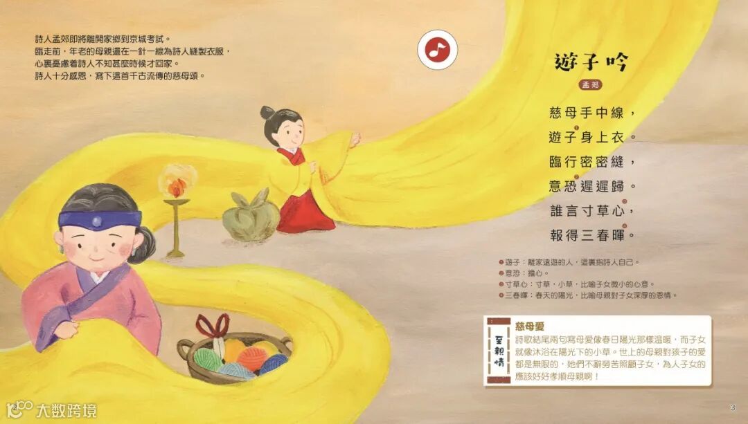 古代詩人把豐富的思想感情和人生經歷,融入精煉的文字之中,寫出觸動人心的作品。〈遊子吟〉中不辭勞苦照顧子女的偉大母愛,〈贈汪淪〉中那份比桃花潭水還要深厚的友情,〈九月九日憶山東兄弟〉中「每逢佳節倍思親」的思鄉情懷‥‥‥這些平常的生活記事,飽含着人與人之間的各種感情,有助陶冶心靈情操,學習與人相處之道。