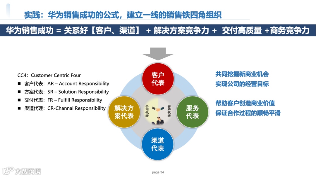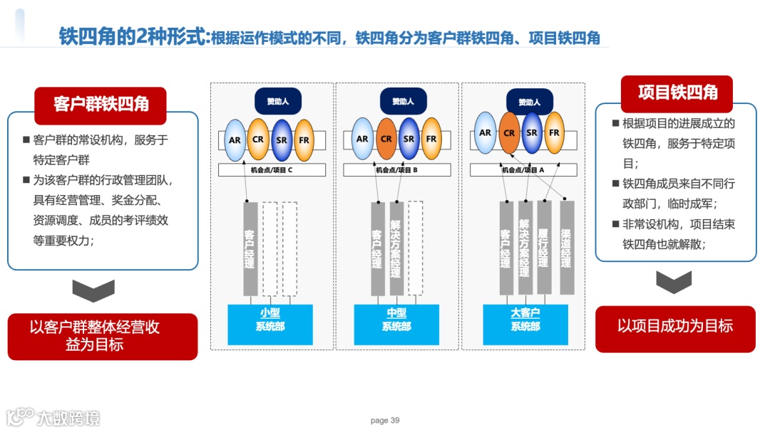 铁四角标配:每个客户群/项目必设AR(客户经理)、SR(解决方案经理)、FR(交付经理)、CR(渠道经理),且四角色同属一个考核单元。