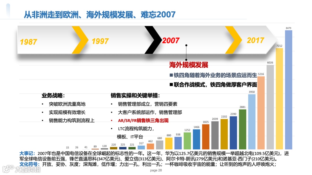 创新:按“片区+BG”划分,如西欧片区下设运营商BG、企业BG,每个BG配备“客户经理+产品经理”组合,典型案例:2007年海外市场突破,铁三角雏形出现。