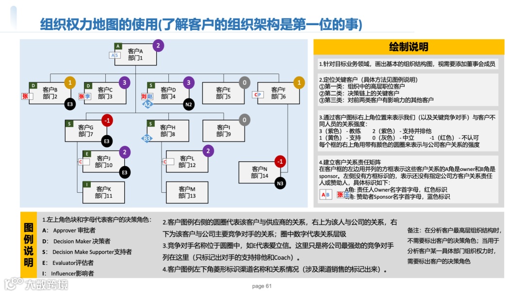 标注客户组织架构、决策角色、关系强度(颜色编码)、责任人和赞助人;