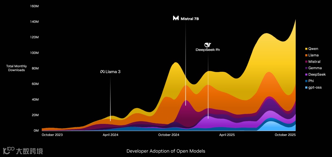 黄仁勋在文章里,特意强调了开源模型的关键作用。现在全球绝大多数的AI模型,都是免费开放的,从DeepSeek-R1到Llama、Qwen、Mistral,这些开源模型,已经能解决绝大多数企业的基础需求。