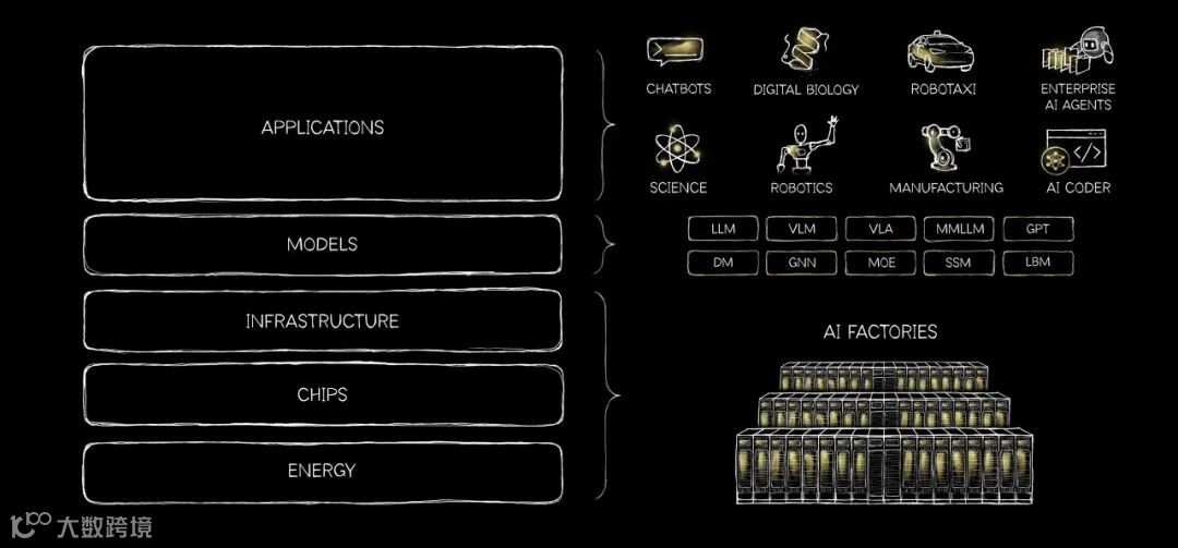 也正是因为“智能是实时生成的”,所以支撑AI运行的,绝不是单一的软件或模型,而是一套从底层能源到顶层应用,环环相扣、层层递进的完整基础设施。这,就是黄仁勋所说的“五层蛋糕”。