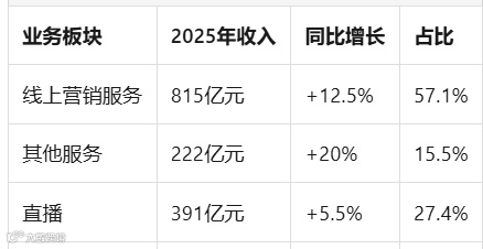 2025年,公司线上营销与直播基本盘稳固,电商业务快速增长,可灵AI贡献新增收入。但财报发布后股价大跌超14%,市场疑虑源于AI板块整体回调,并非否定业绩本身。