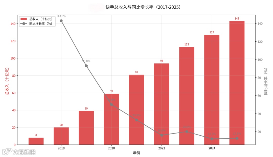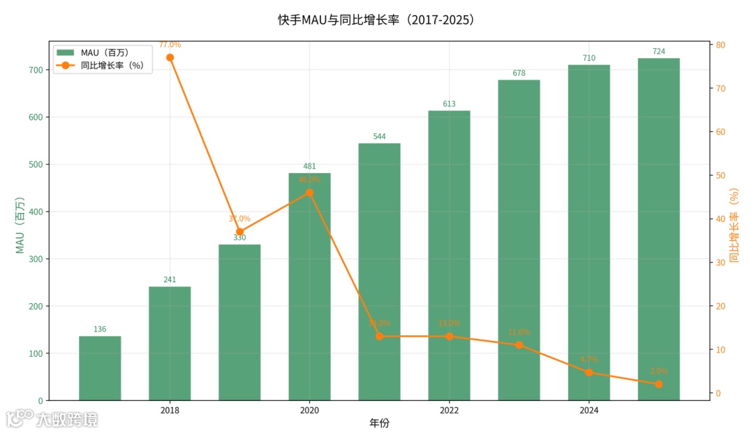 2025年四季度起实现自我造血,全年收入约10.4亿元;全球用户超6000万,合作企业超3万家。其战略意义在于突破用户增长天花板——快手国内DAU约4.1亿、MAU约7.24亿已趋饱和。