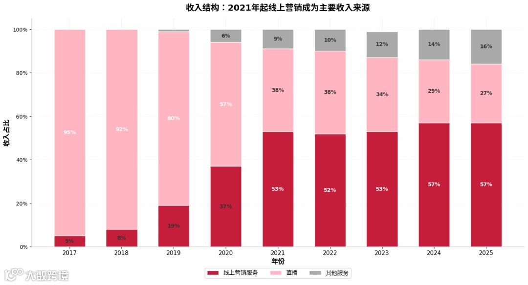 从2017年起,快手已从依赖直播打赏的平台,蜕变为以广告为核心、电商快速发展的多元化商业体。这源于外部环境变化与平台主动转型:2020年后直播政策收紧,短视频用户激增至8.18亿人,品牌广告预算加速向短视频平台迁移;同期直播带货爆发,推动内容电商崛起。