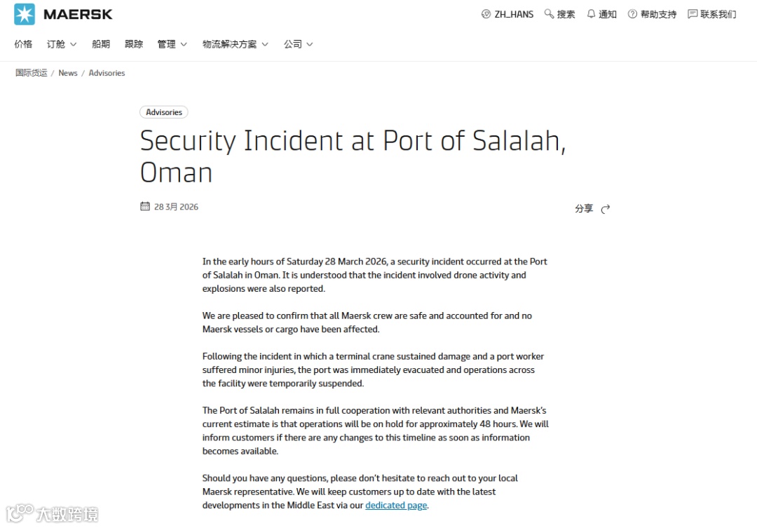 近期中东地区港口安全事件频发,阿曼萨拉莱港和伊朗霍尔木兹海峡附近码头接连遭遇袭击,马士基已宣布暂停相关作业,国际航运航线或受短期影响。
