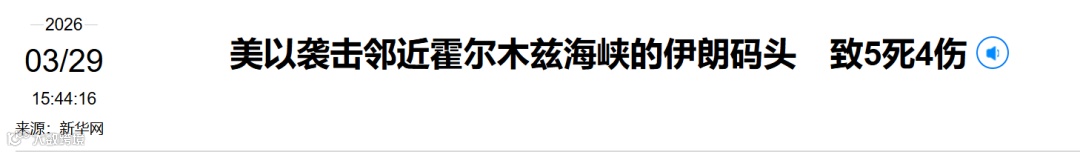3月29日,据伊朗伊斯兰共和国通讯社报道,美国和以色列袭击伊朗霍尔木兹海峡附近码头,造成5人死亡、4人受伤,具体位置尚未明确。