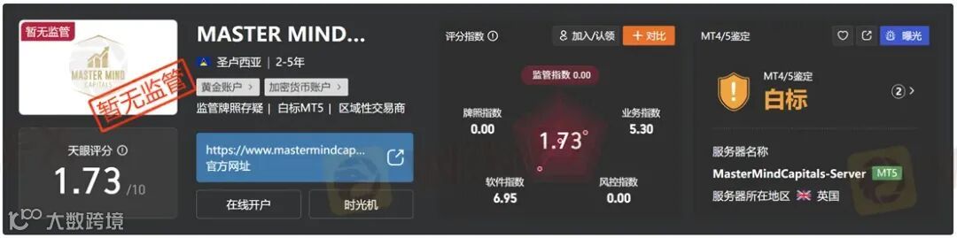 该平台未公示任何监管信息及注册地,仅宣称由MasterMind Capitals Limited运营。用户在尝试出金时遭“涉洗钱”指控,被索要50%保证金;投诉后平台提出需撤销投诉且账户全亏方可返还本金。