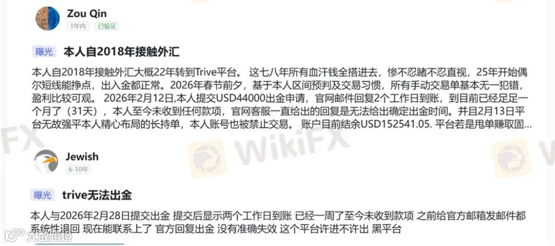 Trive(trive.com)为荷兰金融服务集团,其国际实体Trive International Limited提供全球多资产经纪服务。近期大量用户反馈出金障碍:长线单遭强制平仓后账户被封、出金遭系统性邮件退回等。