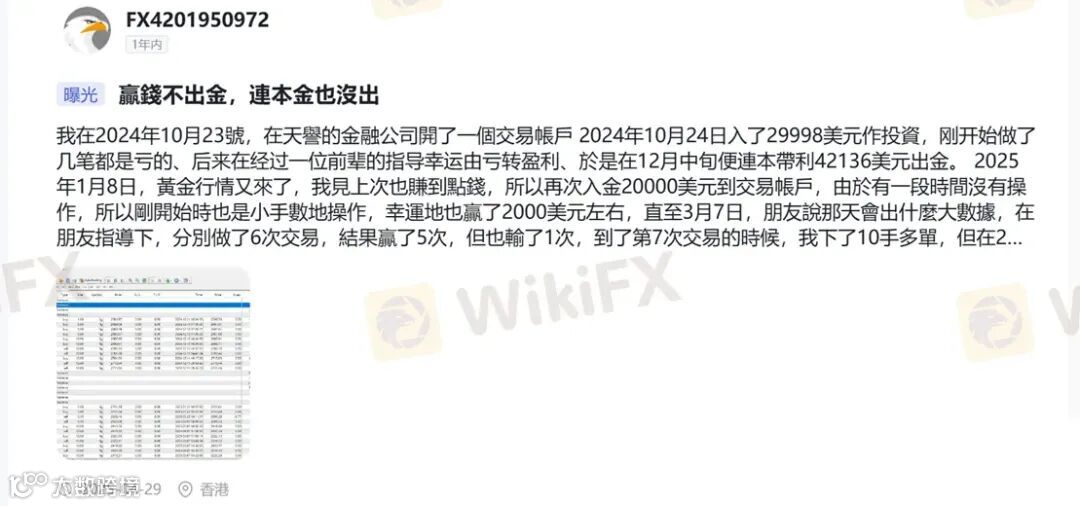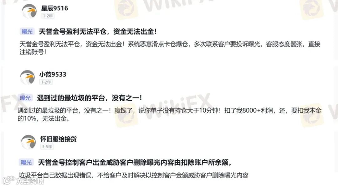 作为香港金银业贸易场AA类025号行员,天誉国际专注于伦敦金银现货杠杆交易。外汇天眼累计收到28条投诉,主要涉及盈利出金受阻、非农行情期异常强平等。