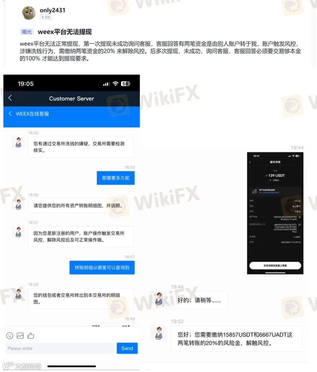 此WEEX为仿冒正规交易所的欺诈平台,无真实监管信息及公司资质,常通过更换域名如weekdefi.com运作。骗子以“量化合作内幕消息”诱导入金,初期制造虚假盈利后,以“税费”“安全金”等名义阻止出金。